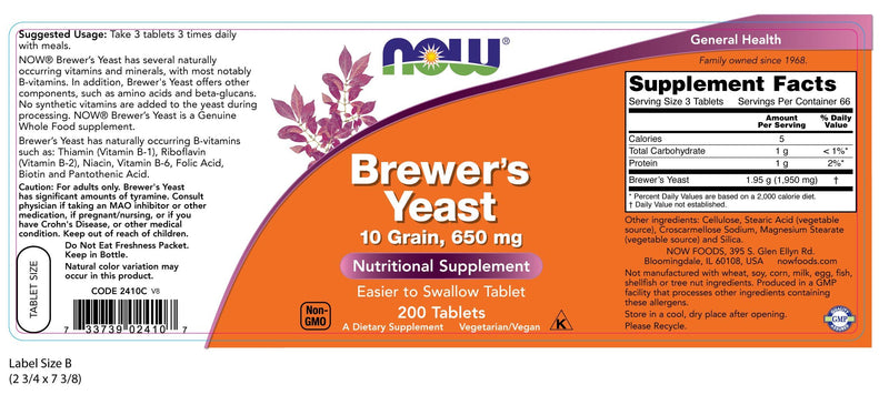 NOW Brewer’s Yeast has several naturally occurring vitamins and minerals, with most notably B-vitamins. In addition, Brewer's Yeast offers other components, such as amino acids and beta-glucans. No synthetic vitamins are added to the yeast during processing. NOW Brewer’s Yeast is a Genuine Whole Food supplement.
