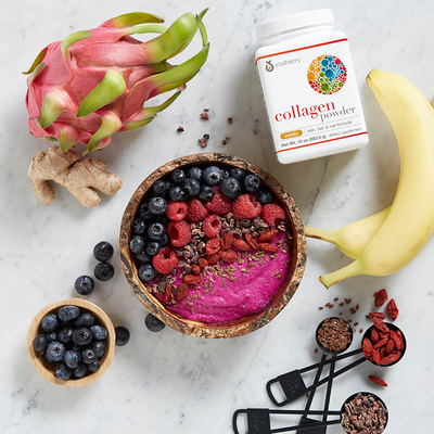 Collagen is a major structural protein in the human body (found in skin, joints, bones, blood vessels and connective tissues). As we age, collagen naturally breaks down and diminishes over time – leading to the early signs of aging.