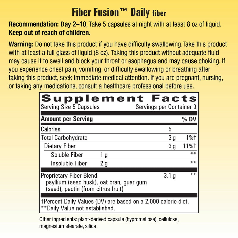 Caution: Do not use if pregnant or nursing. If taking prescription drugs, consult your healthcare practitioner prior to using Fiber Fusion PLUS.