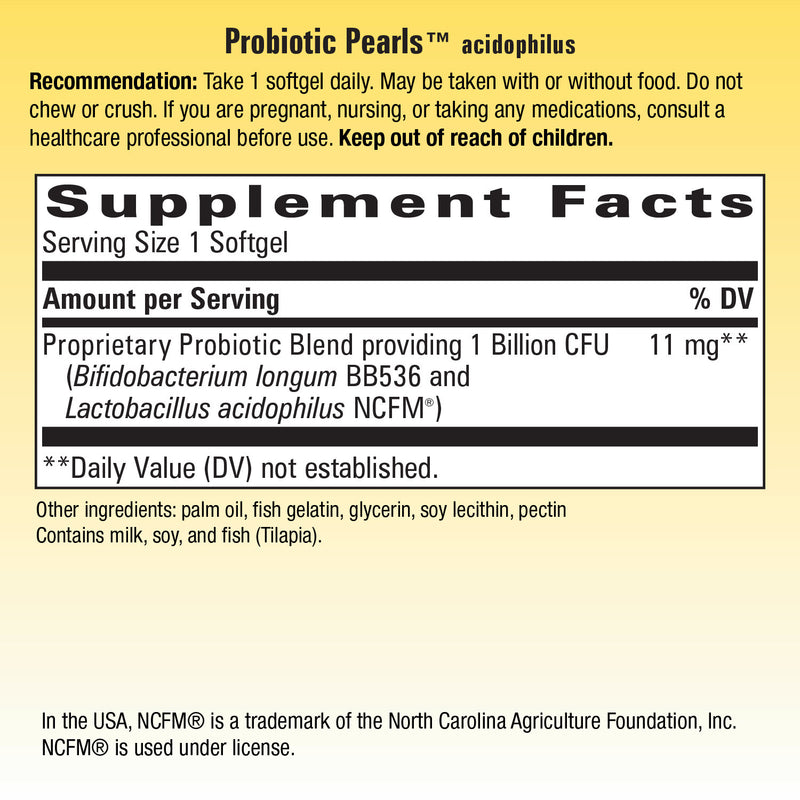 Supplement FactsAcidophilus Pearls Active CulturesServing Size: 1 capsule | ||