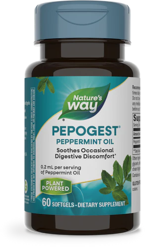 Pepogest provides peppermint oil in enteric-coated softgels that withstand stomach acid to release directly into the intestine.