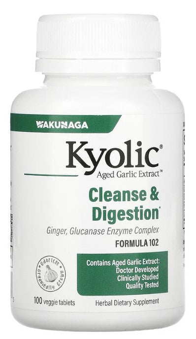 Kyolic® Aged Garlic Extract™ Formula 102 Cleanse & Digestion contains a unique synergistic combination of 600 mg of Aged Garlic Extract, along with ginger, and the enzymes glucanase, lipase, and protease to support GI cleansing, healthy intestinal function and digestive balance.*