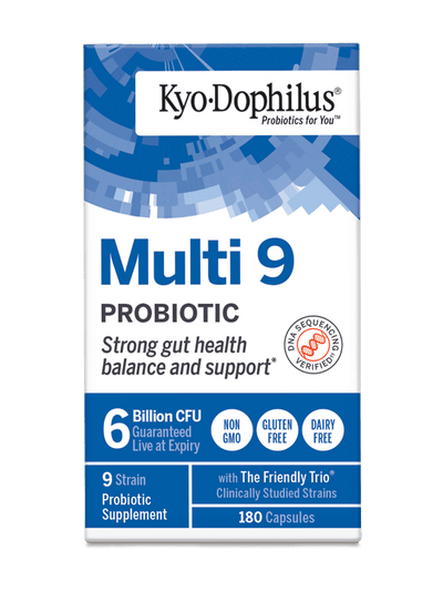 Kyo-Dophilus 9 is formulated with three Lactobacilli strains and six Bifidobacterium strains. This unique blend of nine probiotics contains specially cultured human strains of friendly bacteria that are carefully processed to retain viability at room temperature, insuring an adequate number of cells for colonization in the intestines.
