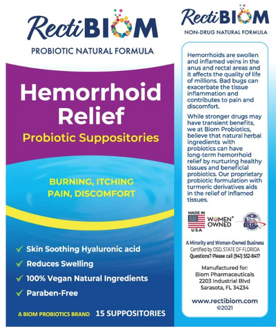 RectiBiom® is formulated with a powerful combination of probiotics, turmeric extract, aesculus hippocastanum extract, hamamelis virginiana extract for reducing swelling and stinging pain related to inflammation.