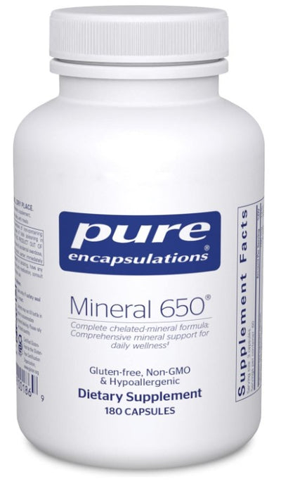 Every capsule of Mineral 650 contains both iron and copper. Iron is commonly contained in red meat , so many people eating a standard American diet may not require additional intake; however , supplementation can be helpful for quite a few , including menstruating women , since substantial amounts of iron tend to leave the body through period blood.Take three to six vegetable capsules daily , in divided doses with meals. At the recommended dosage , each 180-capsule bottle of Mineral 650 by Pure Encapsulations should last from one to two months.Pure Encapsulations seeks to formulate and manufacture high-quality , hypoallergenic dietary supplements. Quality control during the formulation and manufacturing process is paramount. All Pure Encapsulations products are made with the most bioavailable ingredients possible.
