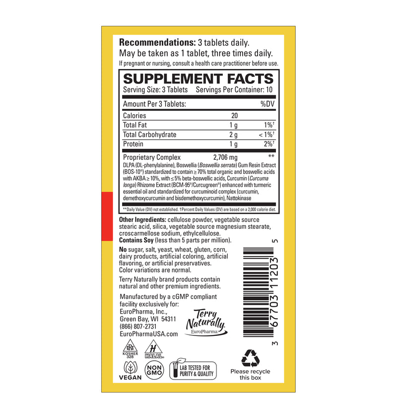 DLPA (DL-phenylalanine), Boswellia (Boswellia serrata) Gum Resin Extract (BosPure) standardized to contain >70% Total Organic and Boswellic Acids with AKBA >10%, with less than 5% beta-boswellic acids, Curcumin (Curcuma longa) Rhizome Extract (BCM-95) standardized for curcuminoid complex (curcumin, demethoxycurcumin and bisdemethoxycurcumin), Nattokinase
