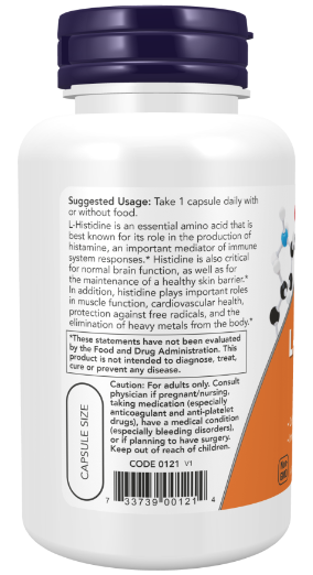 L-Histidine is an essential amino acid that is best known for its role in the production of histamine, an important mediator of immune system responses.* Histidine is also critical for normal brain function, as well as for the maintenance of a healthy skin barrier.* In addition, histidine plays important roles in muscle function, cardiovascular health, protection against free radicals, and the elimination of heavy metals from the body.*