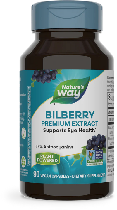 Bilberry is related to the blueberry, and is native to northern Europe, where it is harvested between July and September, when the berries are ripest. Nature's Way® uses an extract of bilberry to guarantee 25% anthocyanins, the component of bilberry that has been shown to promote eye health.