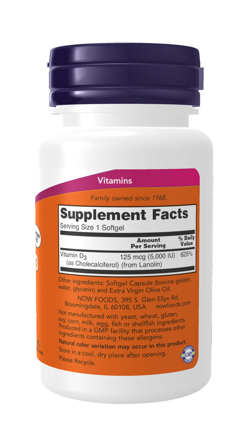 NOW Vitamin D-3 softgels supply this key vitamin in a highly-absorbable liquid softgel form. Vitamin D is normally obtained from the diet or produced by the skin from the ultraviolet energy of the sun. However, it is not abundant in food. As more people avoid sun exposure, Vitamin D supplementation becomes even more necessary to ensure that your body receives an adequate supply.