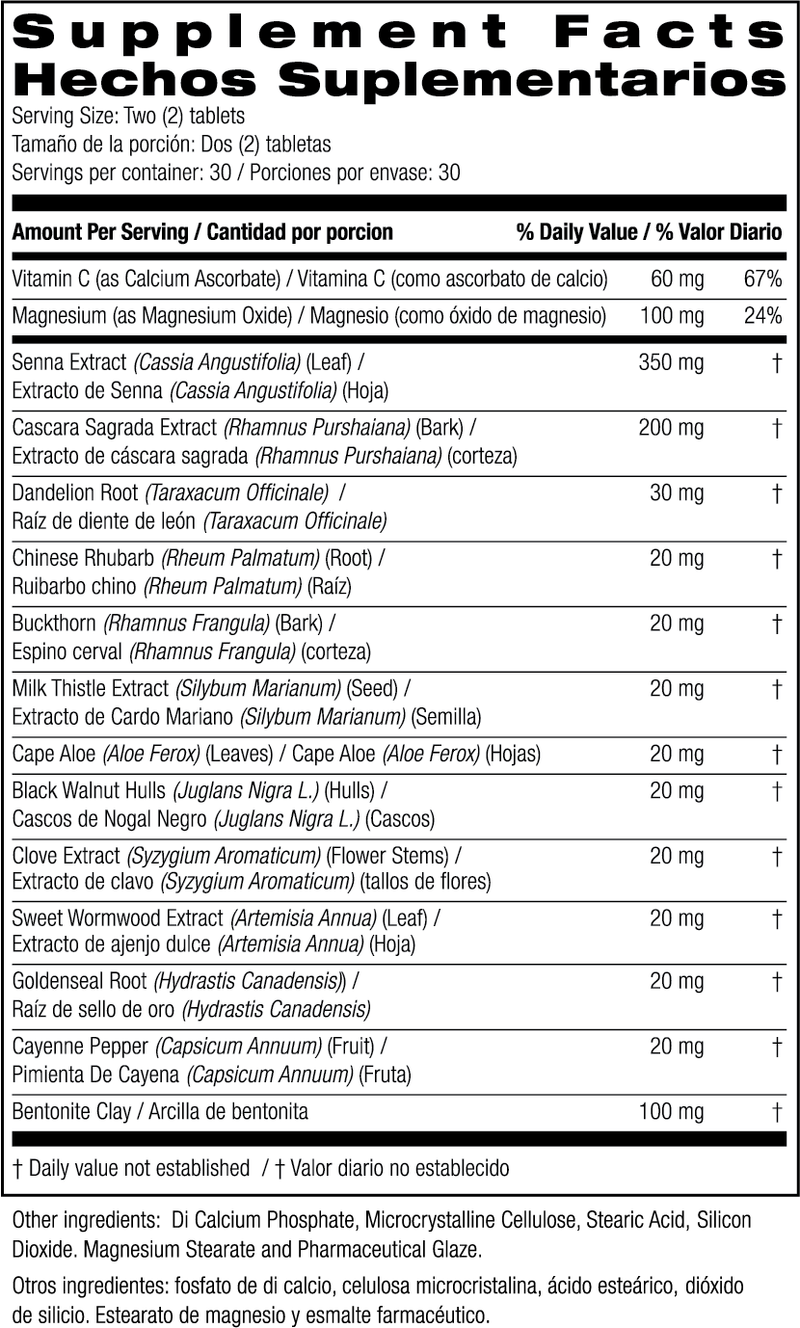 For daily cleansing take one (1) or two (2) tablets after evening meal or before bed. For short term intensive cleansing take one (1) or two (2) tablets two (2) times daily after meals or as recommended by a health care professional.Supplement FactsServing Size: One (1) Tablet | ||