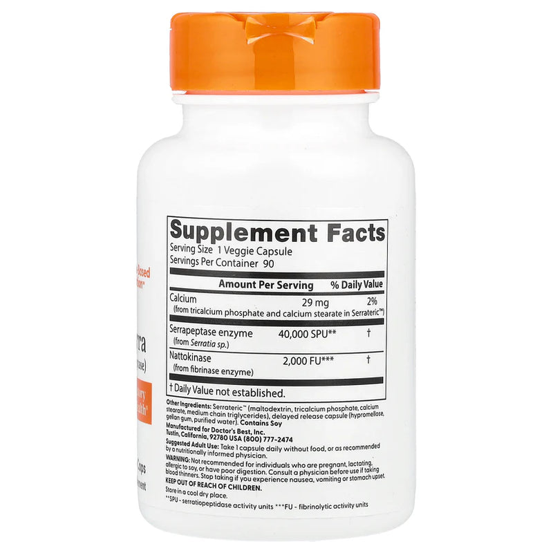 Doctor's Best Natto-Serra is a combination of two natural enzymes that have been used as dietary supplements for decades. Serra-peptase (serratio-peptidase) is a protein-digesting enzyme isolated from the friendly bacterium Serratia E-15 discovered in the Japanese silkworm. Nattokinase also digests protein and is derived from “natto,” a fermented soy food popular in Japan for centuries. This nattokinase is free of vitamin K. The serrapeptase is formulated with Serrateric, a superior alternative to enteric coating that protects the enzyme until it reaches the intestine for optimal absorption.
