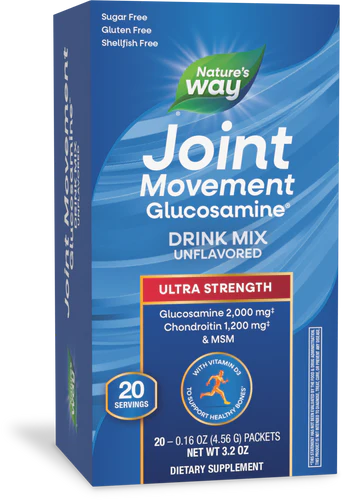 Nature's Way Joint Movement Glucosamine Drink Mix is an ultra strength, unflavored drink mix that provides 2,000 mg of glucosamine, a building block of cartilage tissue; 1,200mg of chondroitin, a component of connective tissue; 500 mg MSM, a source of sulfur and a mineral vital in the formation of collagen; 50% Daily Value vitamin D3 to help promote healthy bones and muscle function; and 10 mg of hyaluronic acid per serving. This statement has not been evaluated by the Food and Drug Administration. This product is not intended to diagnose, treat, cure, or prevent any disease. (See Supplement Facts for sodium content.)