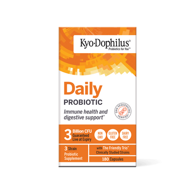 Kyo-Dophilus is formulated with three specially cultured, human, non-dairy, heat-stable, stomach acid resistant strains of beneficial bacteria. This Friendly Trio gives you relief from the inconvenience caused by bad bacteria. Take Kyo-Dophilus during and after a cycle of medication, when you travel and everyday to boost immunity, promote healthy intestinal function and general well-being.