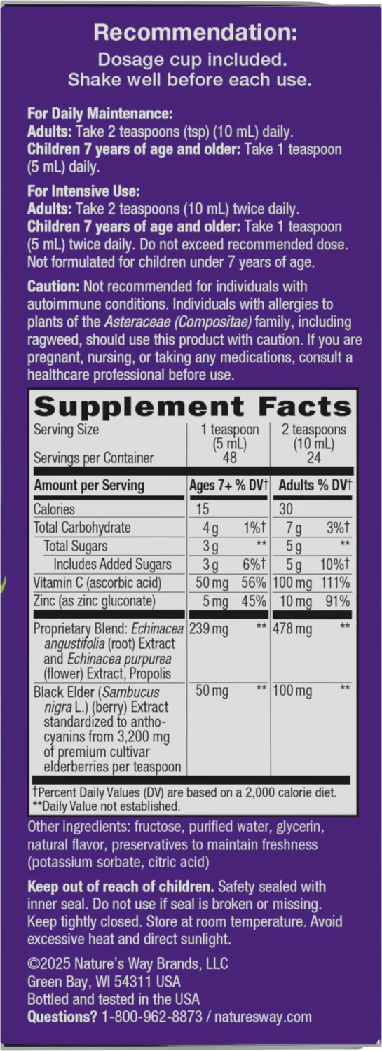 - Nature’s Way Sambucus Immune syrup contains a unique, full spectrum, standardized black elderberry extract
