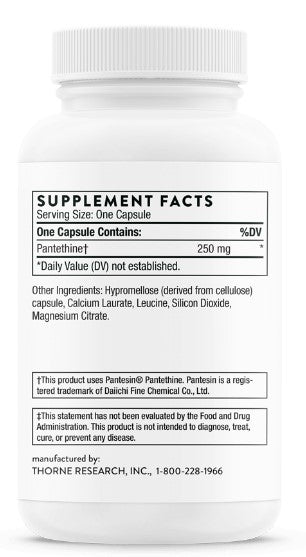 Pantethine – an active form of pantothenic acid, or vitamin B5 – is a vital component of coenzyme A, a cofactor in dozens of enzymatic reactions, including reactions involved in fat and carbohydrate metabolism.* Pantethine appears to facilitate the metabolism of fatty acids by activating coenzyme A, which promotes carnitine's transport of fatty acids into the mitochondria and subsequent intra-mitochondrial oxidation of those fatty acids.* Consequently, pantethine supplementation has been found to support good cardiovascular health.* In addition, increases in beneficial HDL cholesterol and apolipoprotein A1 have been associated with pantethine supplementation.* Pantethine is also considered to be an "anti-stress" vitamin because it supports healthy adrenal cortex function and hormone synthesis, particularly during times of stress.*