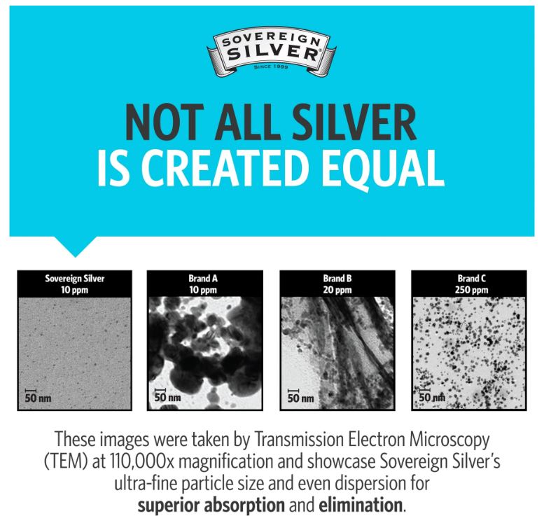 Think Absorption: The smaller the particle size, the easier it is for the body to absorb and eliminate. Sovereign Silver features an unprecedented particle size of 0.8 nm/0.0008 microns, verified by 3rd party. No other silver can prove the same.