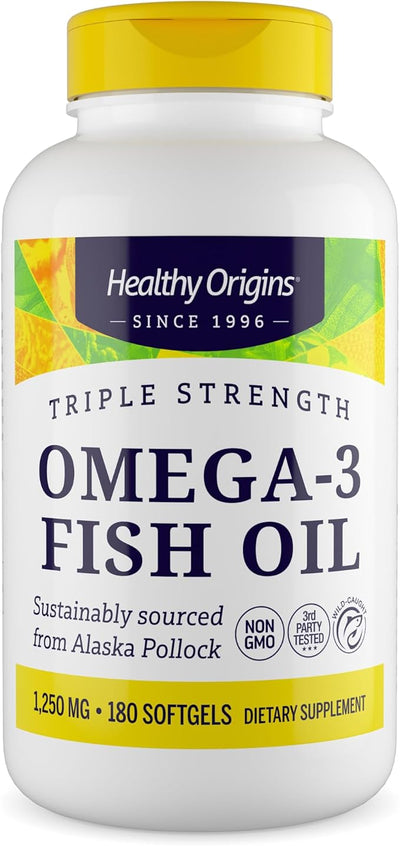 Triple Strength Omega-3 Fish Oil 1250mg from Wild Alaska Pollock, 180 Softgels by Healthy Origins